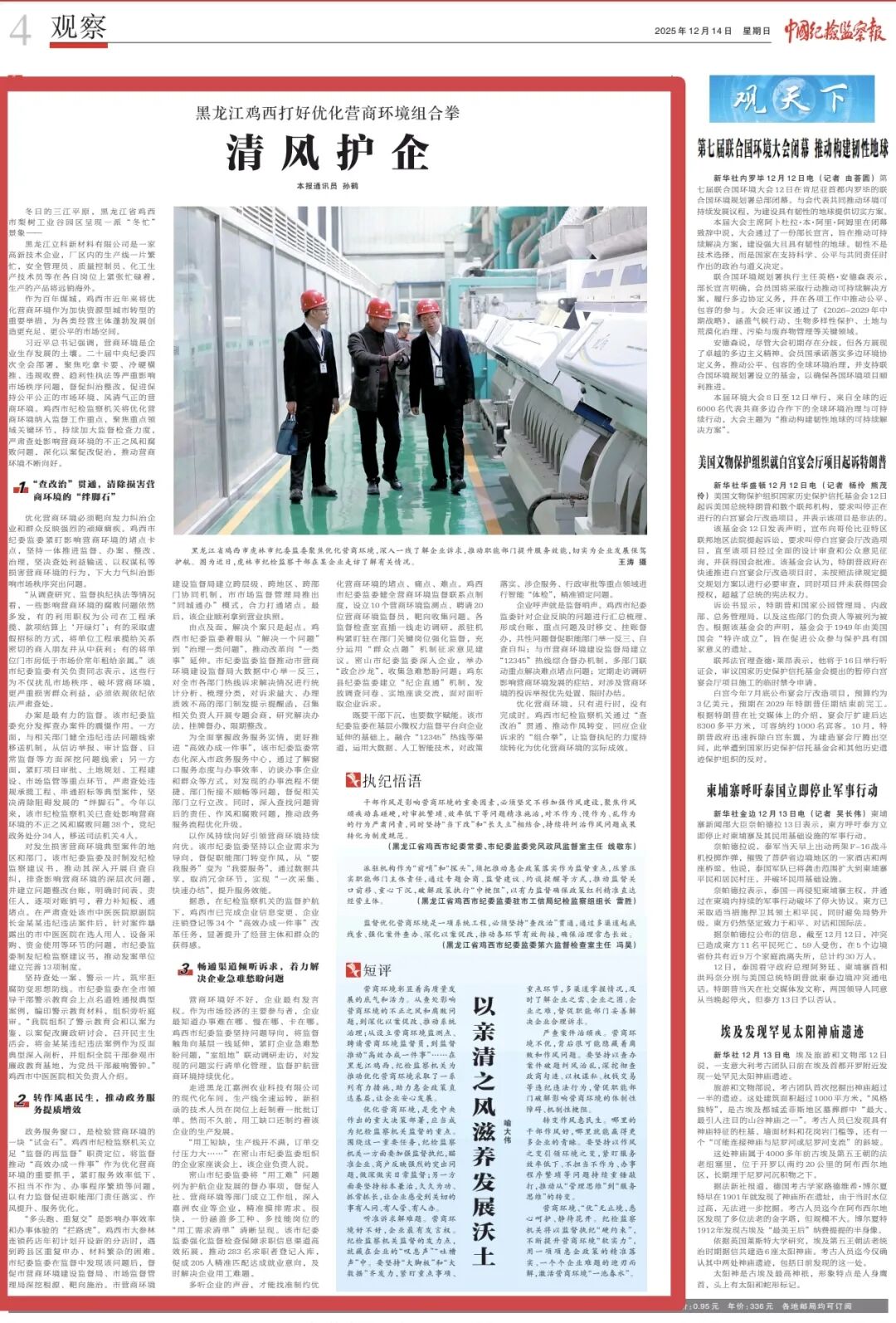12月14日,《中国纪检监察报》观察版“正风反腐在身边·变化看得见”专栏刊文《黑龙江鸡西打好优化营商环境组合拳 清风护企》,介绍鸡西市各级纪检监察机关坚持围绕中心、服务大局,立足职能职责,坚决整治破坏营商环境突出问题,以有力监督助力营造公平公正的市场环境、风清气正的营商环境有关工作情况。