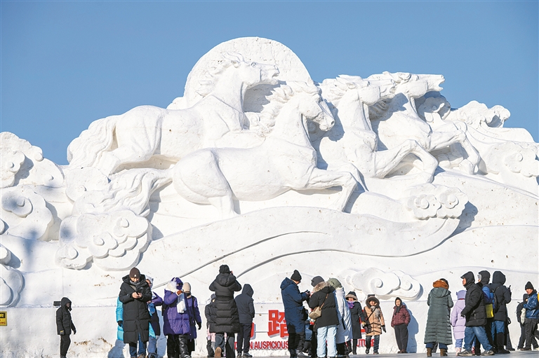 冰天雪地,热火朝天。一个月前,记者初次来到哈尔滨冰雪大世界时,太阳已经落山,冰雪大世界还处在紧张的建设状态。置身园区,与零下二十几摄氏度的低温形成鲜明对比,18个冰建工区与5个雪建工区同步铺开,昼夜不停,机器轰鸣。采访期间,哈尔滨冰雪大世界股份有限公司工程管理部副部长乔海波的电话不断、脚步不停。戴上安全帽,乔海波直奔施工现场,边走边说:“时间不等人,我们既要抢工期,也要保质量。”现在,冰雪大世界已经开园迎客。中央广播电视总台2026年春节联欢晚会将在哈尔滨设分会场,冰雪大世界还将举办系列活动,这让每一位冰雪大世界人都热血沸腾、干劲十足。