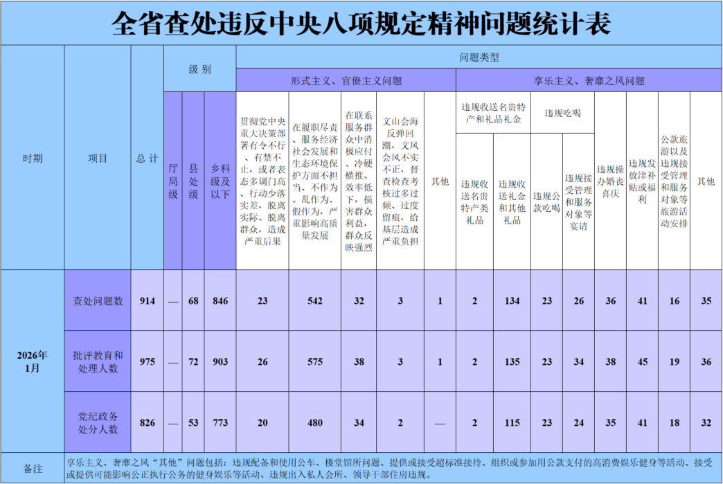 2026年1月黑龙江省查处违反中央八项规定精神问题914起