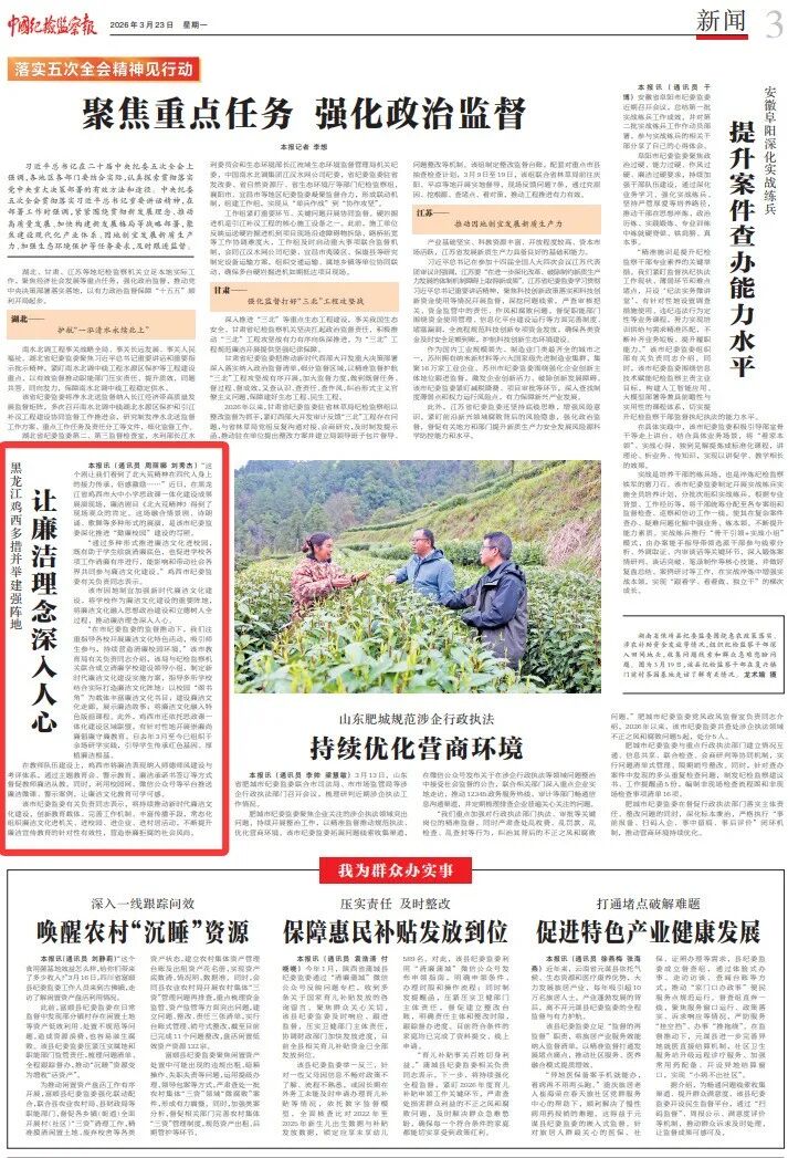 3月23日,《中国纪检监察报》刊文《黑龙江鸡西多措并举建强阵地 让廉洁理念深入人心》,介绍鸡西市纪委监委丰富内容供给、创新教育方式,因地制宜深入推进“勤廉校园”建设,不断增强新时代廉洁文化的传播力、吸引力、感染力,着力营造崇廉拒腐良好风尚有关工作情况。