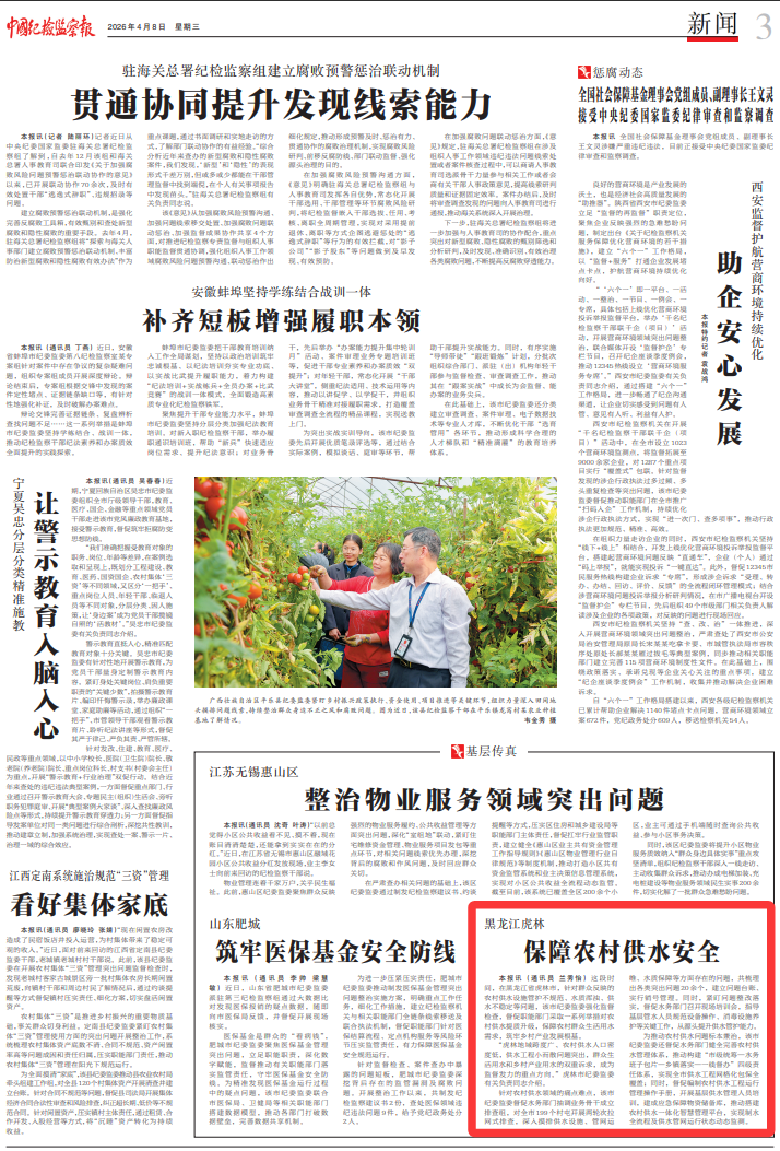 4月8日,《中国纪检监察报》刊文《黑龙江虎林保障农村供水安全》,介绍虎林市纪委监委强化监督,推动保障农村群众生活用水需求,筑牢乡村产业发展根基有关工作情况。