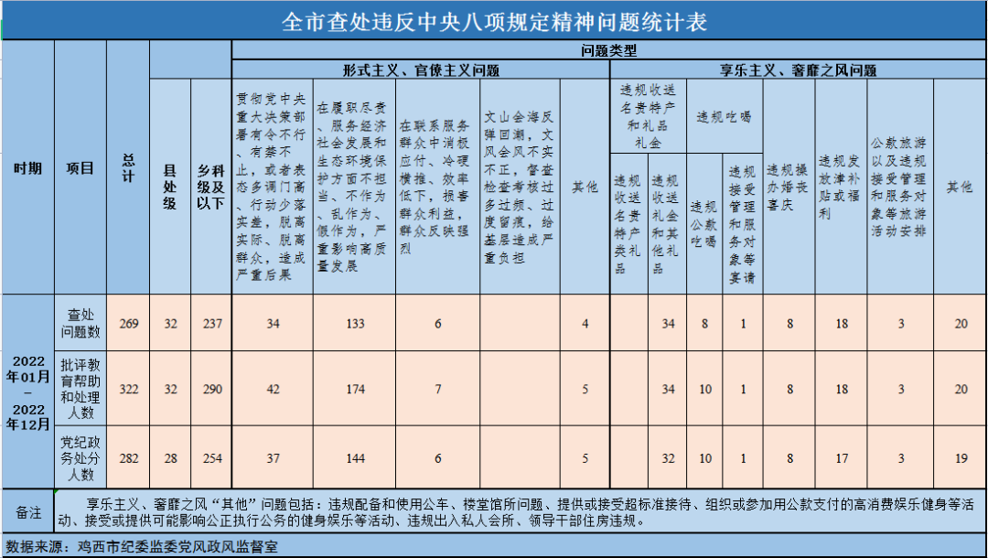 2022年以来,全市各级纪检监察机关深入贯彻落实习近平总书记关于加强作风建设的重要论述,深入分析“四风”问题突出表现,强化政治监督,做实日常监督,统筹推进纠“四风”树新风工作。全市共查处违反中央八项规定精神问题269起,批评教育帮助和处理322人,其中,党纪政务处分282人。
